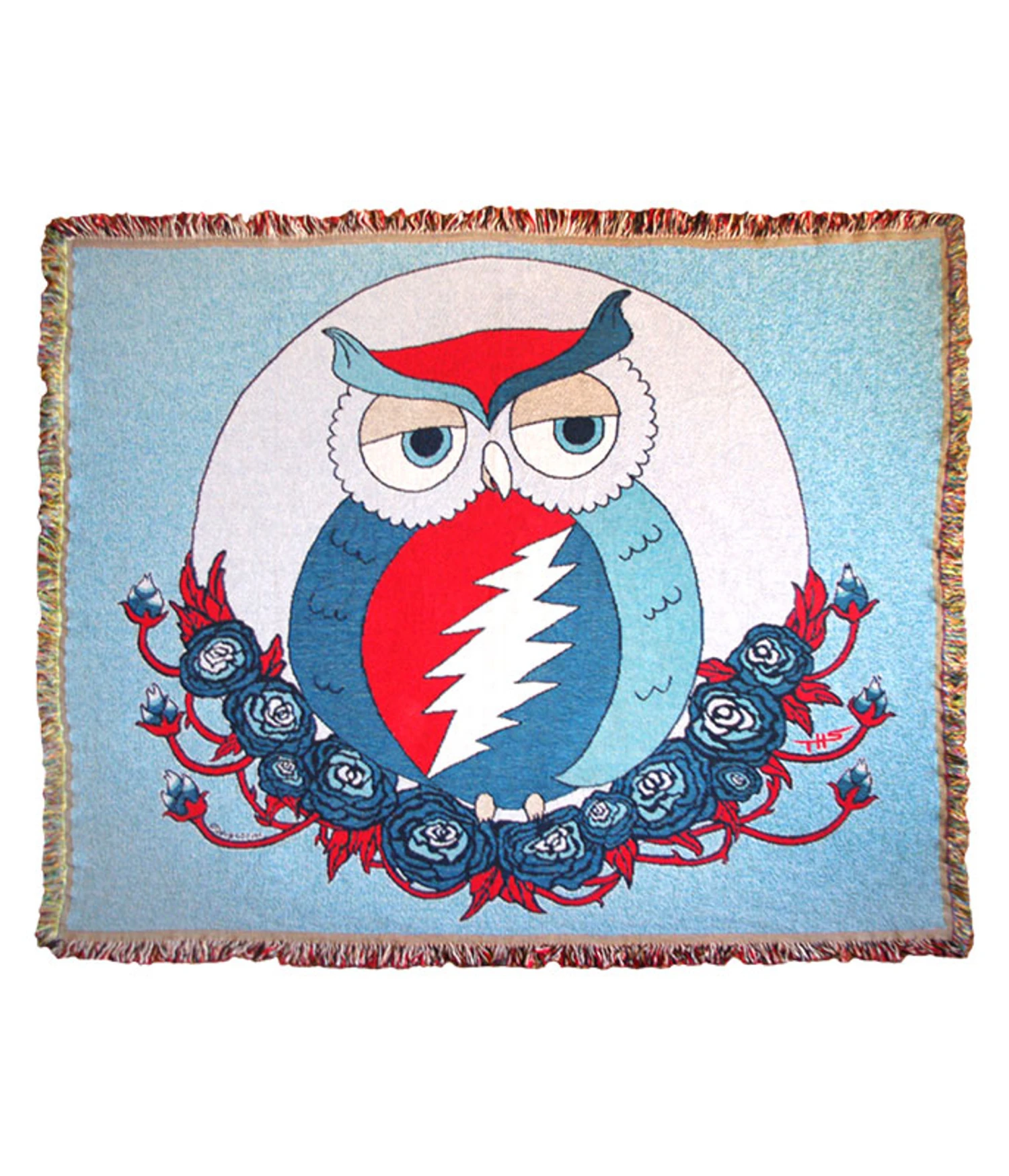 The Steal Owl Woven Blanket featuring the art of Taylor Swope. Measures 53 in. x 69 in. 100% cotton. Grown and woven in USA. Perfect for picnics, naps under trees, festivals or a throw for your home. Care Instructions : Machine Wash Cold, Front Load Commercial washer, Mild Detergent or hand wash Mild detergent. Tumble low or Dry clean. Officially Licensed Rock and Roll Merchandise | Gifts & Accessories
