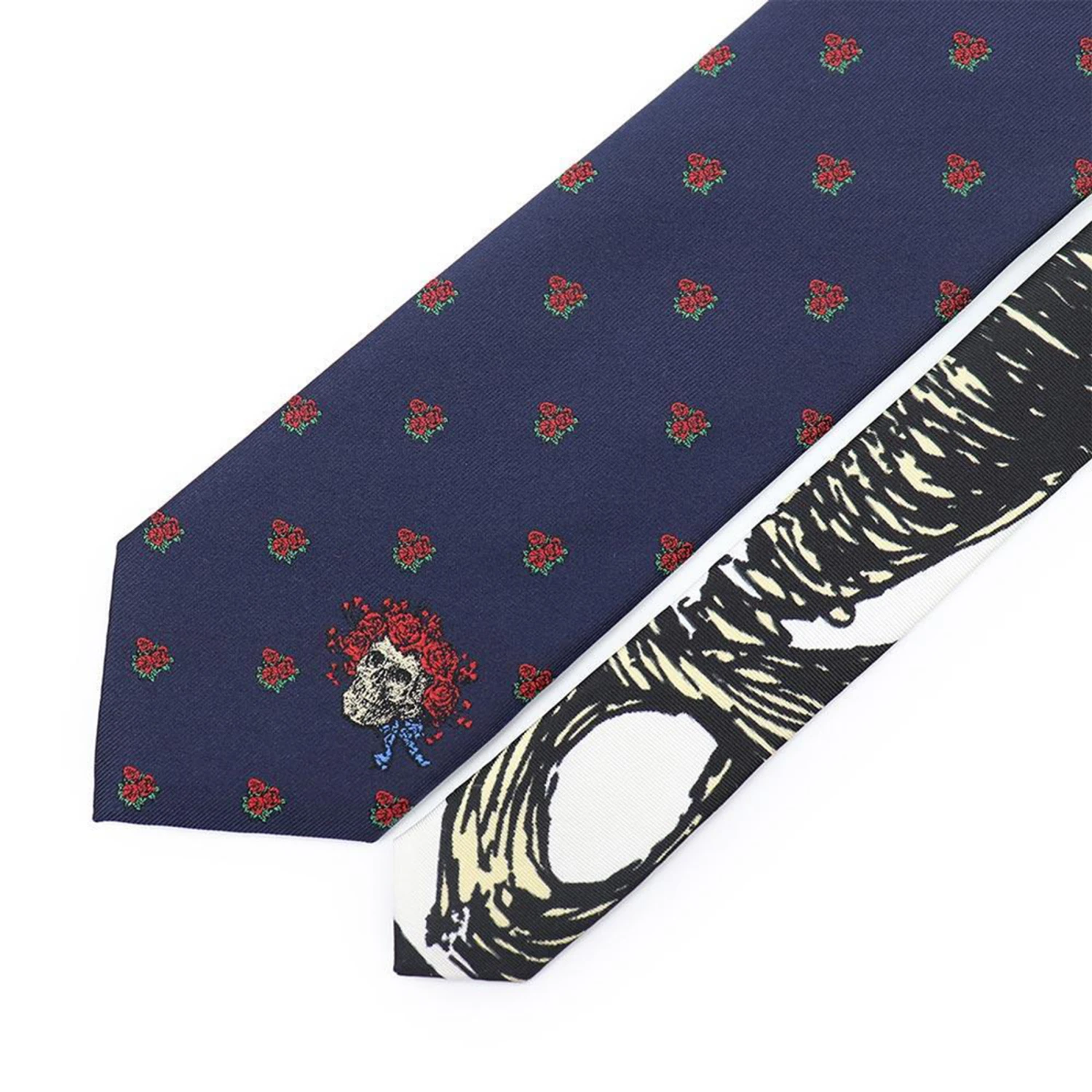 The Grateful Dead Navy Bertha Skull and Roses Tie shows many elements. Small roses are evenly spaced throughout the tie while the infamous skull and roses emblem lives in the lower corner. The back of the tie possesses delicate and beautiful hints of Bertha. This is hands down the coolest tie on the market. The Navy Bertha Skull and Roses Tie features double loops with more matching rose contrast so all heads of any shape and size can represent their love for the Dead. We strive for the highest quality so each tie is made of 100% 16 momme twill silk and traditionally silk-screen printed. No corner was cut and no detail untouched. Navy Bertha Skull and Roses Tie. Officially Licensed by the Grateful Dead.