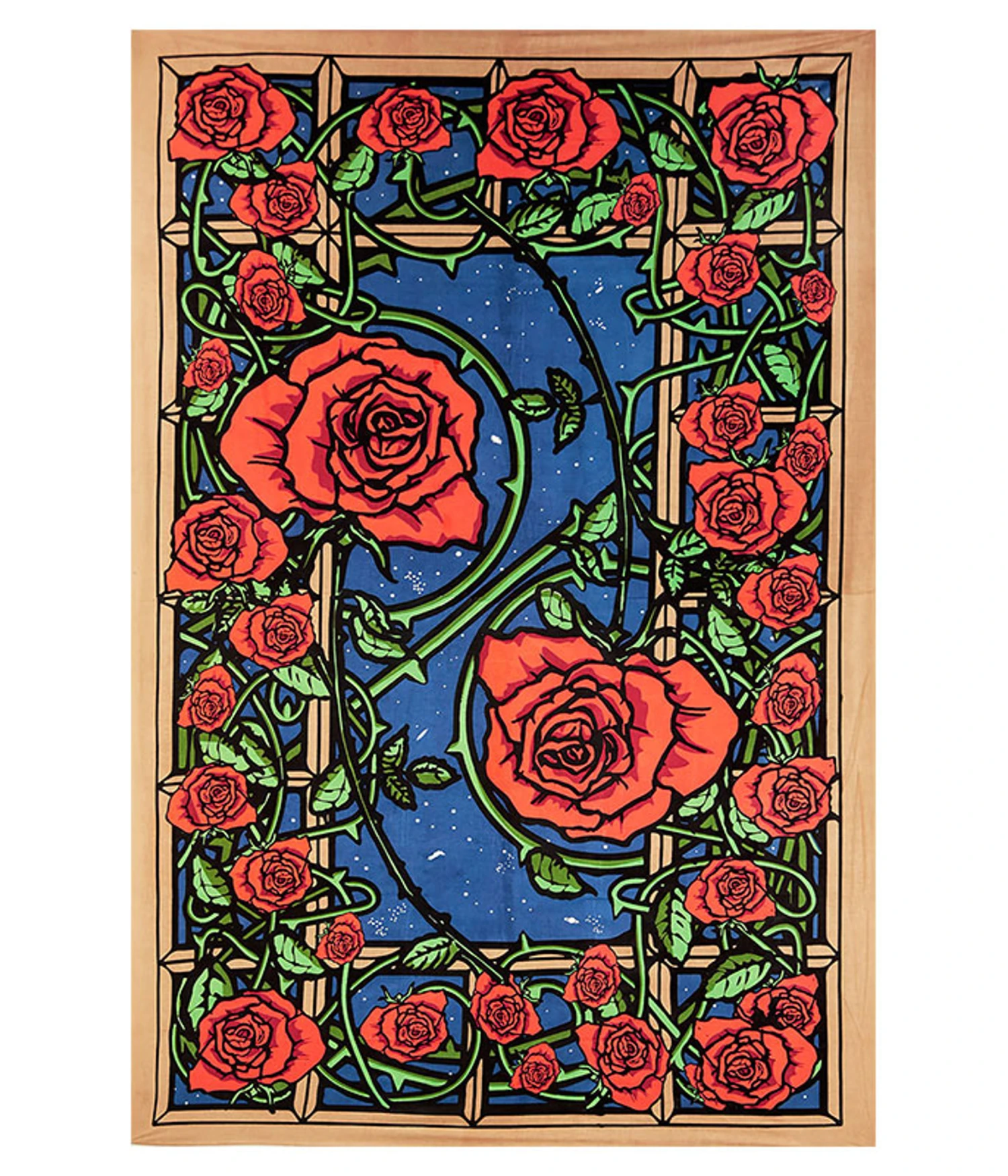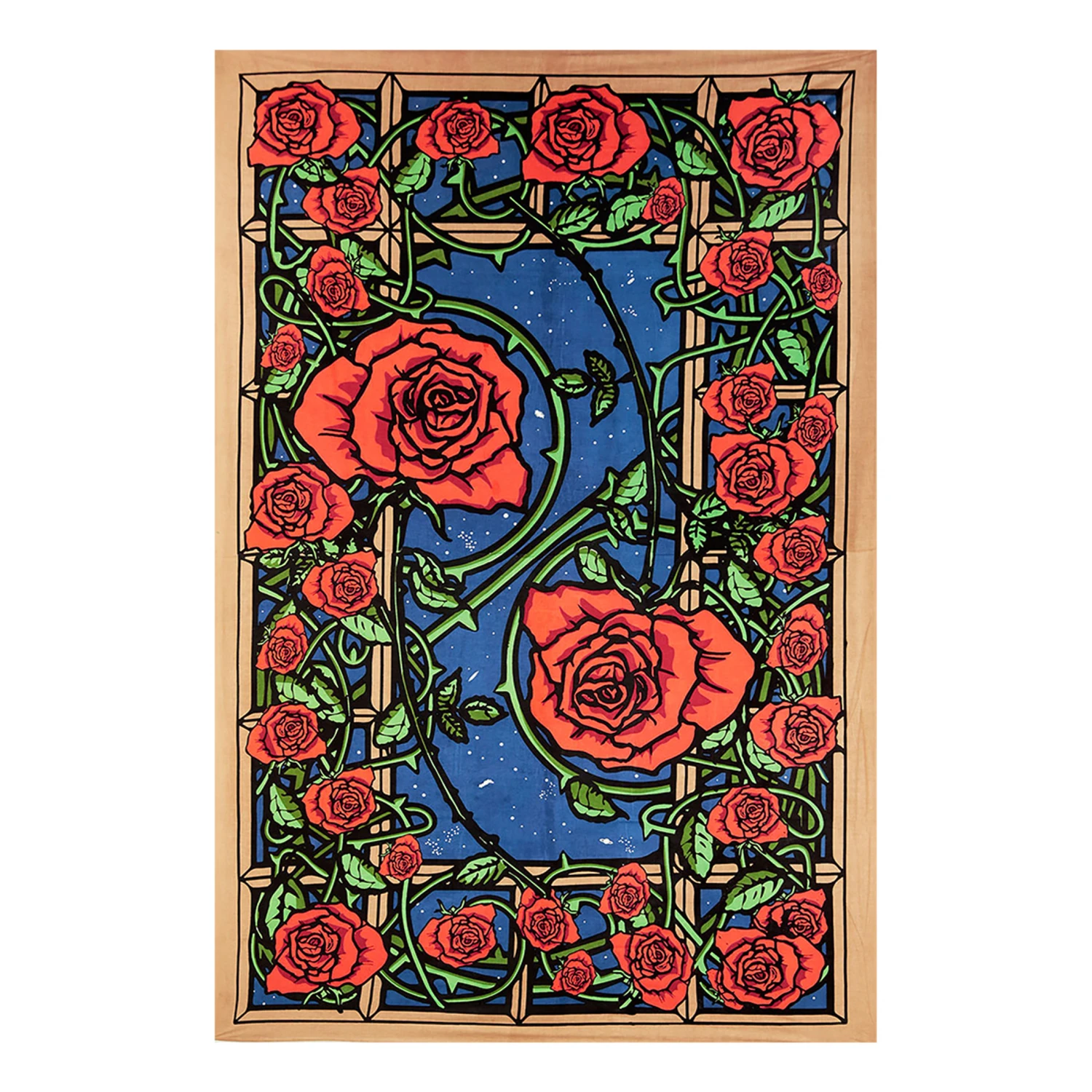 Liquid Blue Merchandise | Gifts & Accessories. This tapestry measures 90″ X 60″. Mesmerizing roses dance off the vine when viewed in 3D. Black light reactive. (*3D glasses are not included)