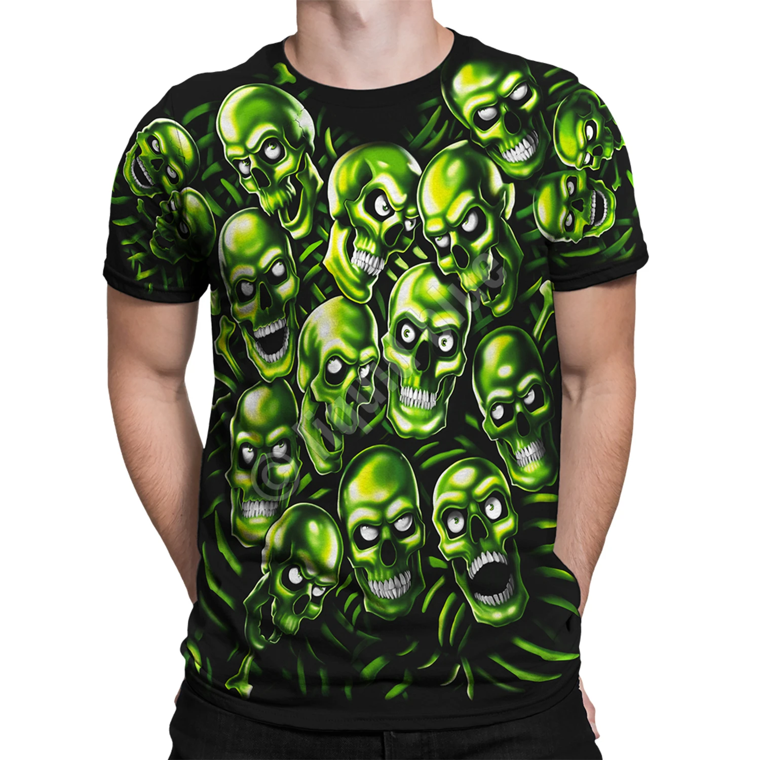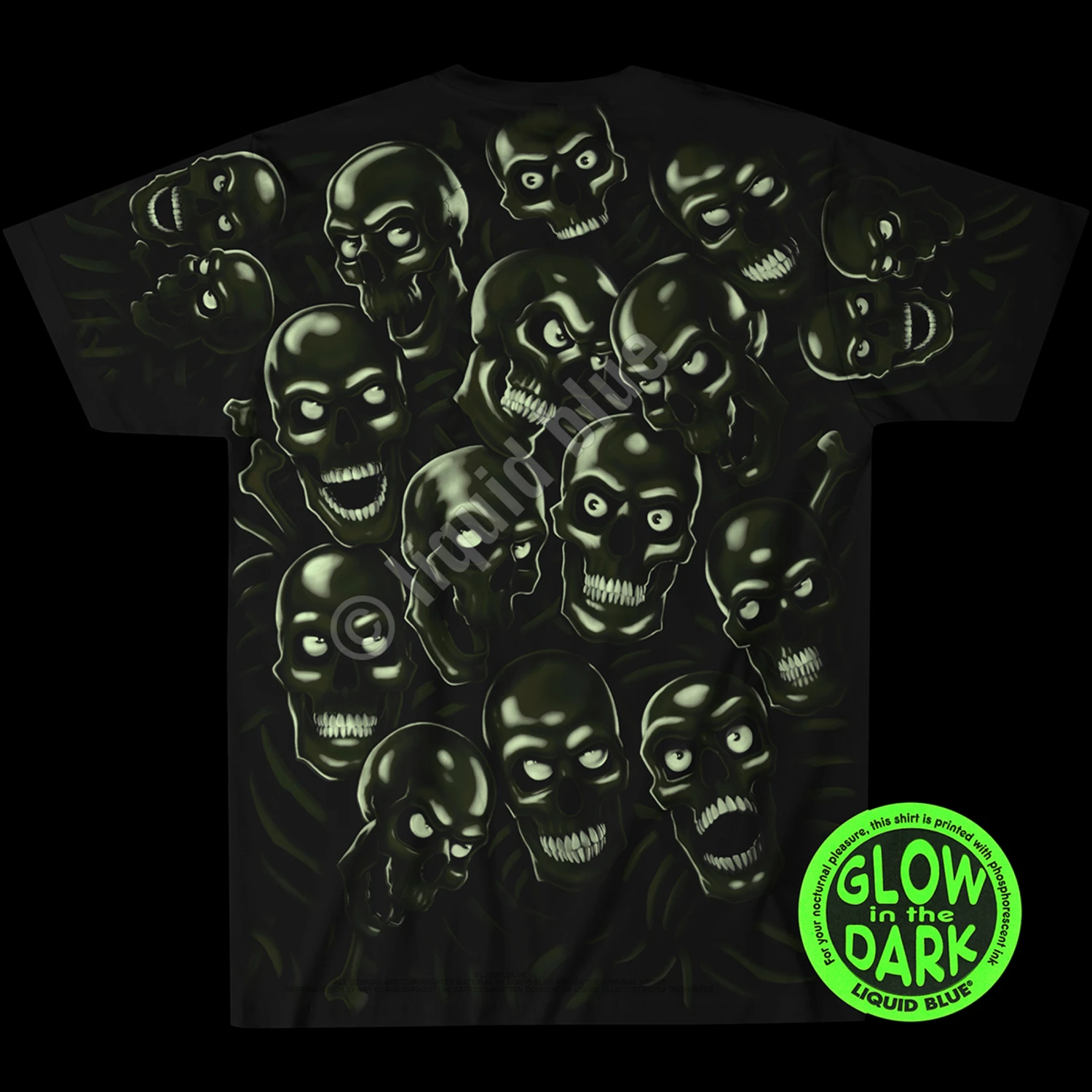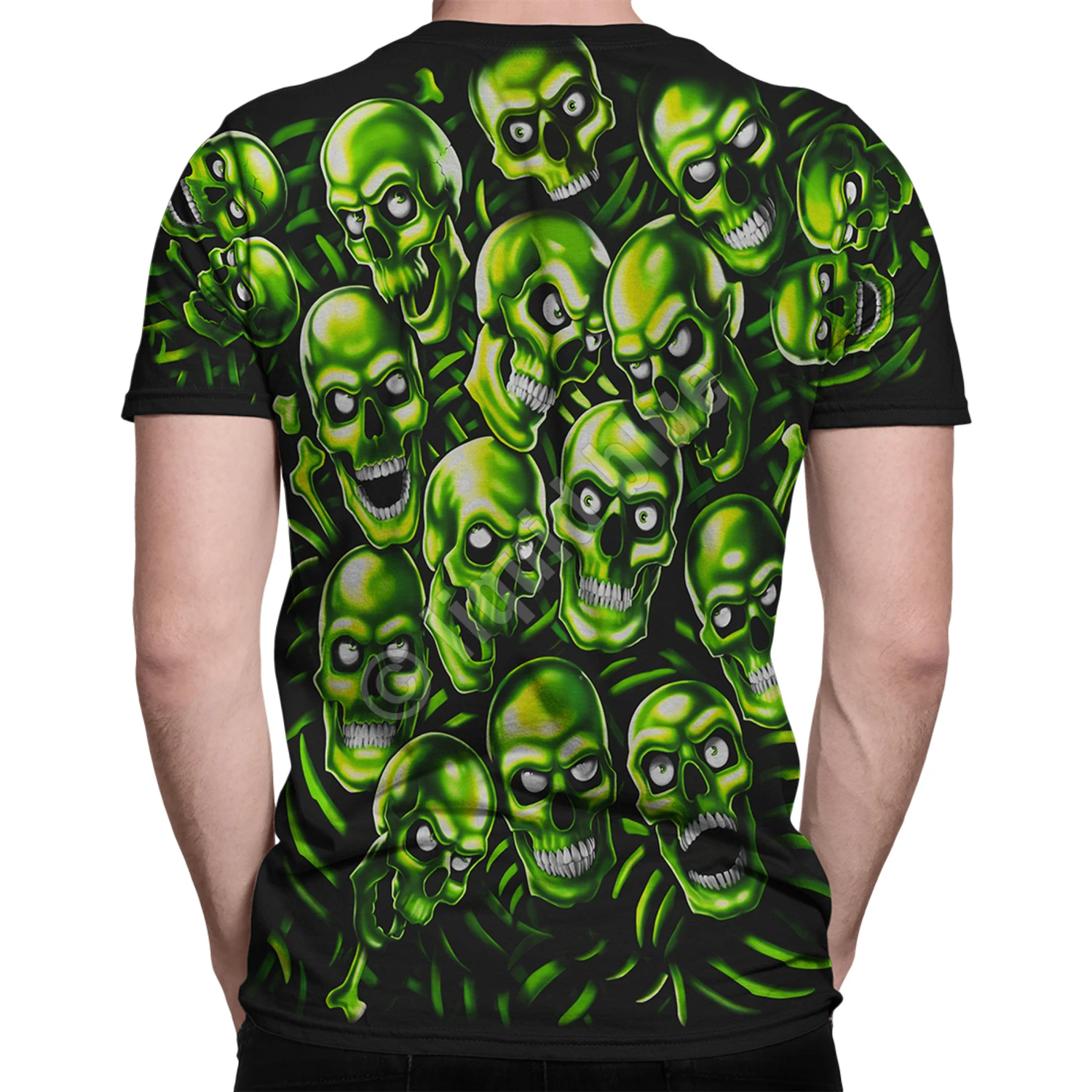 This green skull T-shirt features a stunning all-over print and glows in the dark. Rapper Juicy J The North Memphis Hustler is proudly clad in Skull Pile as seen on Three 6 Mafia’s “Stay Fly” music video from their 2005 release “The Known Unknowns”. Light up at your next house party or club, and don’t forget it’s perfect for Halloween. Recently worn on stage by Travis Scott.
