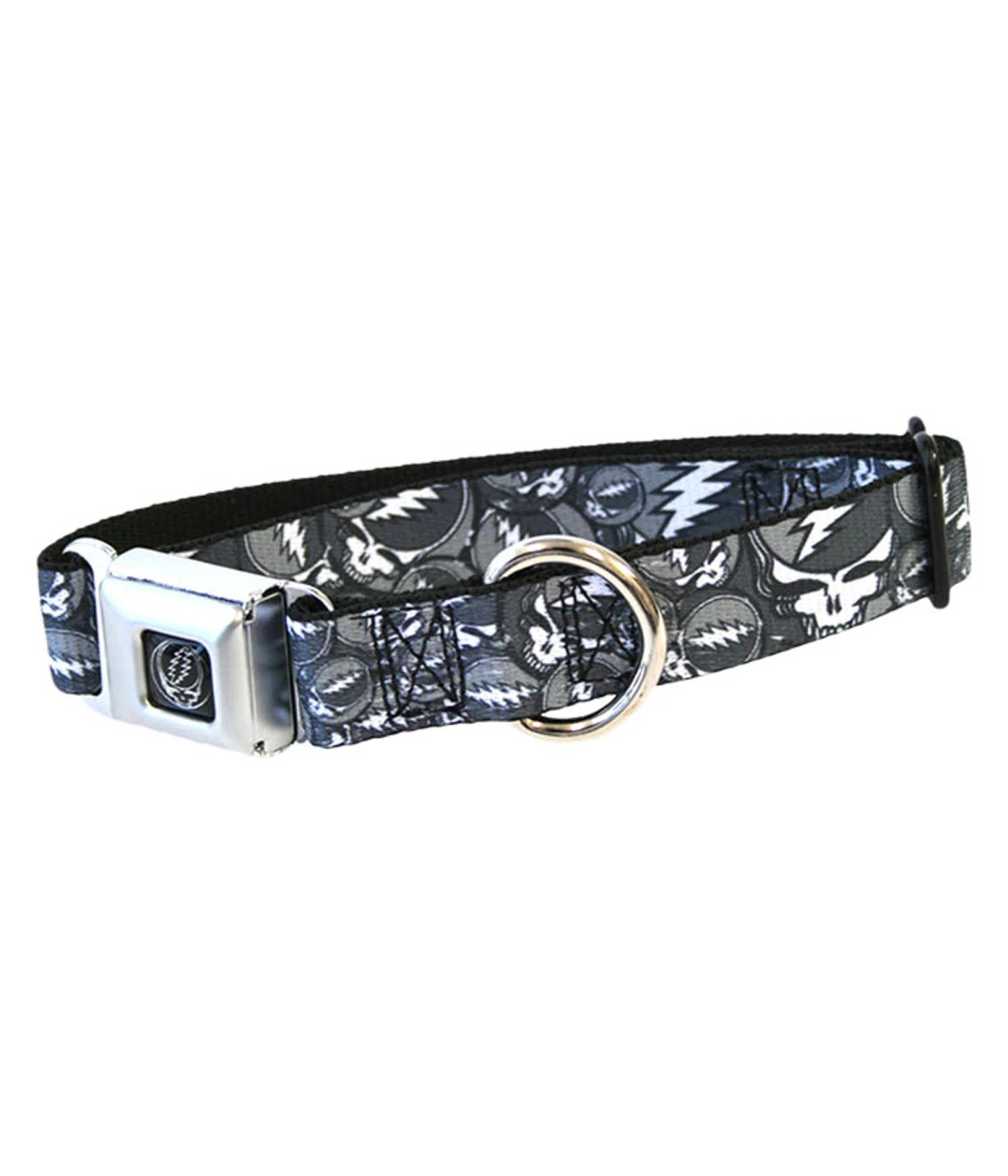 Large Dog Collar is 1 inch wide and fits 15 inch – 26 inch neck. Licensed Grateful Dead Dog Collars are made with a miniature seatbelt buckle which conveniently releases with the push of a button. The incredibly unique graphic work on a nylon strap is sure to catch the attention of everyone around. Product Features: Welded stainless steel D ring for leash attachment.